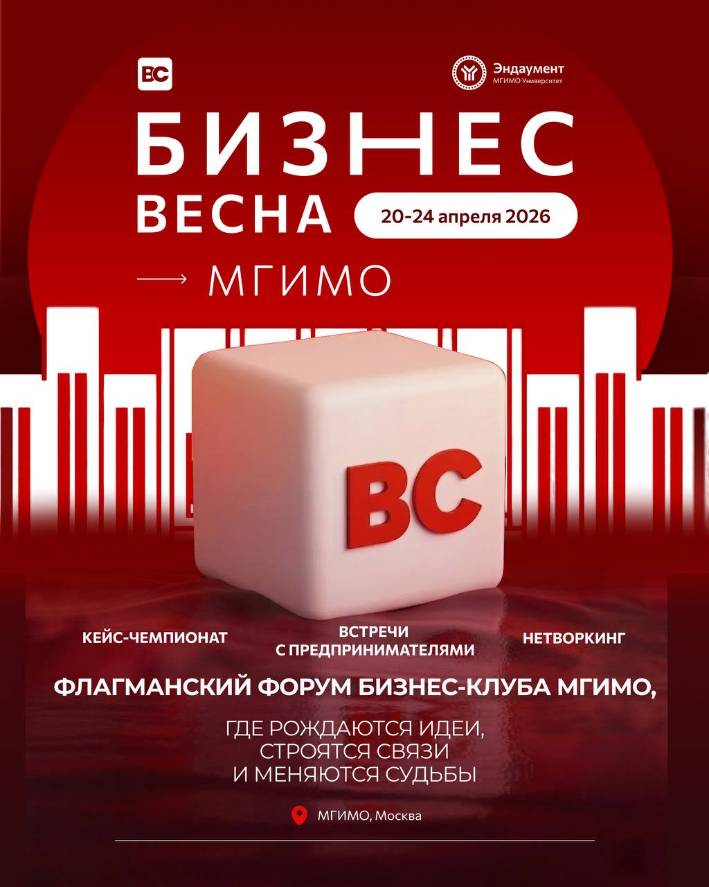 БИЗНЕС-ВЕСНА МГИМО 2026 Тип: форум Дедлайн: нет информации Призовой фонд: нет информации Кто может участвовать: студенты и действующие предприниматели Суть: Бизнес-клуб МГИМО приглашает на ежегодный предпринимательский форум, где участники смогут получить новые знания, начать их применять и нетворкать. В программе — выступления спикеров, кейс-чемпионат, питч-сессия и панельная дискуссия. Ссылка на заявку: spring.bcmgimo.ru