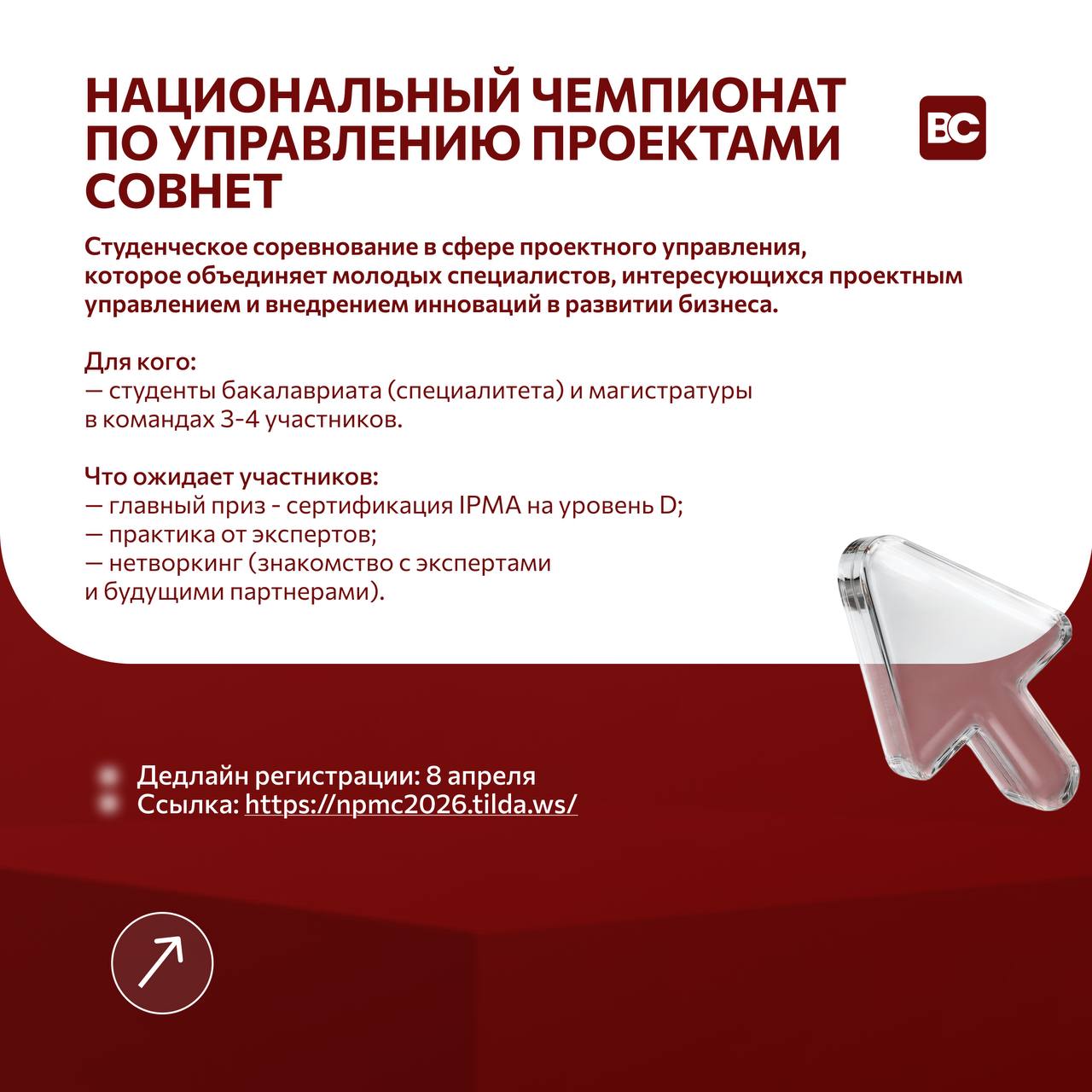 Национальный чемпионат по управлению проектами СОВНЕТ Тип: конкурс. Дедлайн: 8 апреля. Призовой фонд: не указан. Кто может участвовать: студенты бакалавриата и магистратуры в командах 3–4 человека. Суть: студенческое соревнование по управлению проектами, участники получат сертификат IPMA на уровне D, практику от экспертов и возможности для нетворкинга. Ссылка на заявку: не указана.