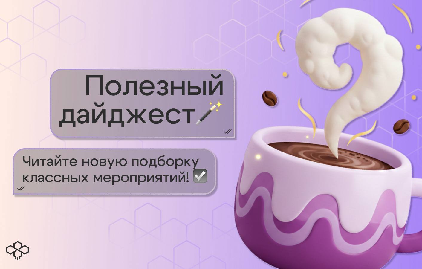 [Содержимое изображений] Main subject is a decorative purple and white cup with a foam question mark. Visible text in Russian reads "Полезный дайджест" and "Читайте новую подборку классных мероприятий!". Content type is a promotional graphic.